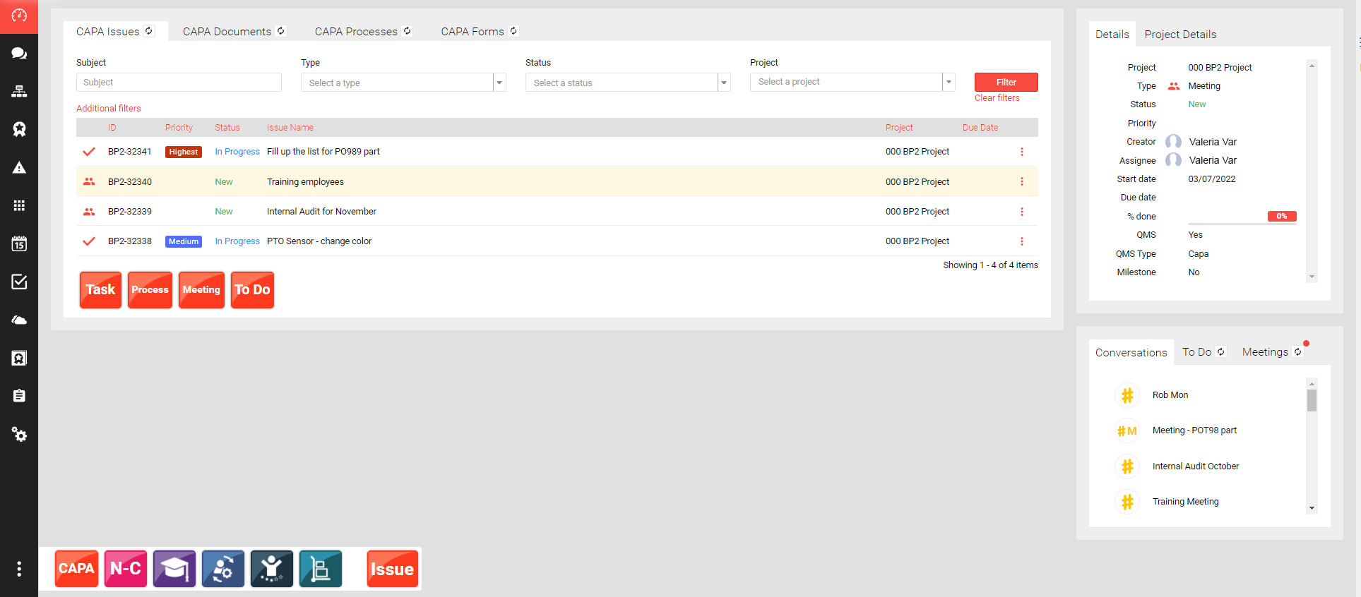 All Issues related to CAPA are presented in that CAPA module (regardless of the project where it was created, where you have permission to access). You can perform all the necessary tasks directly from these modules: from creating CAPA tasks, CAPA meetings, creating or starting CAPA processes, as well as creating custom CAPA issue forms.