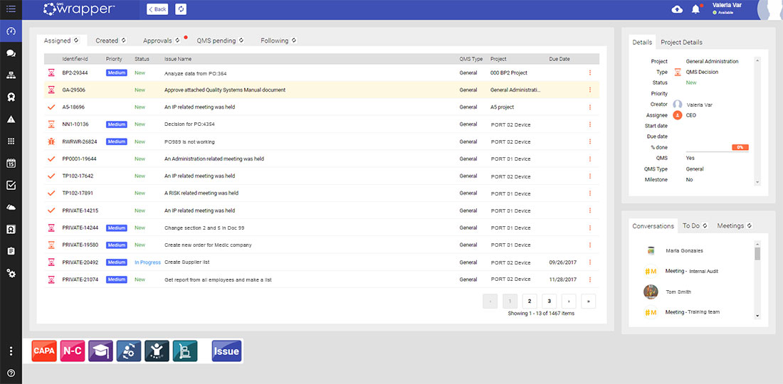 Six important QMS functions are now grouped by Tabs and accessible by Buttons, these include CAPA, Nonconformities, Training, Change, Feedback, and Supplier management. For example, all CAPA issues, processes, meetings, etc. related to CAPA, can be easily found in the CAPA Tab and accessed by the CAPA button.