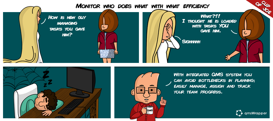 qmsWrapper gives a real-time visual overview of all user tasks - percentage done, reports and assignments. Monitor who does what with what efficiency. Instantly identify any overlaps in the work and easily reassign tasks as needed, follow the over-all productivity and keep track of milestones, QMS issues, deadlines, upcoming events, to-dos and due dates at a glance.