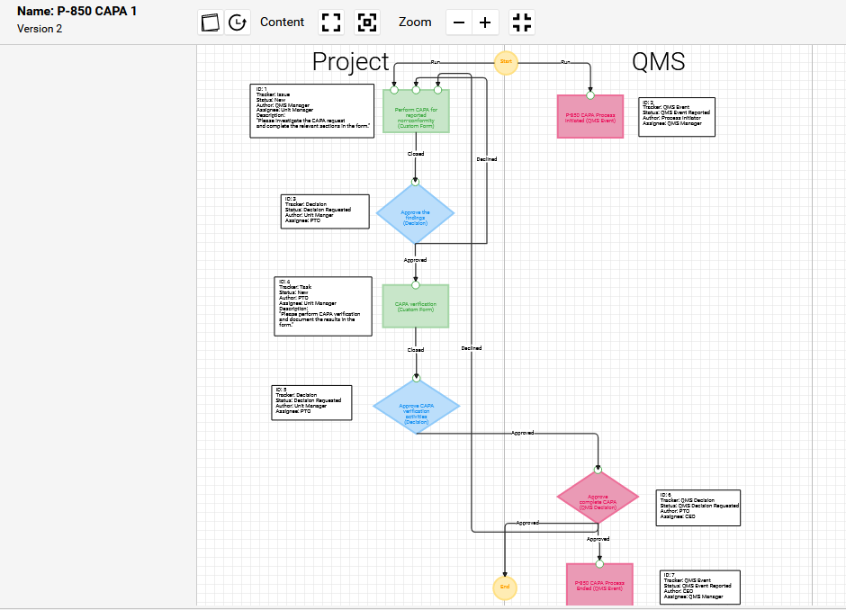 qmsWrapper is built to support the processes approach. It comes with already included processes that address QMS requirements. Therefore, processes are defined through the flowcharts as the sequence of tasks or templates that are that can be assigned to specific users, depending on the process.